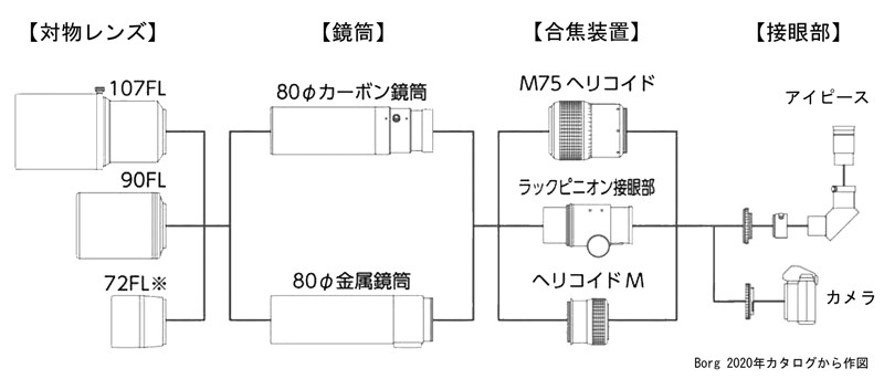 | 分解できる | もともと、パーツを組み合わせて天体望遠鏡を作る設計(Borg