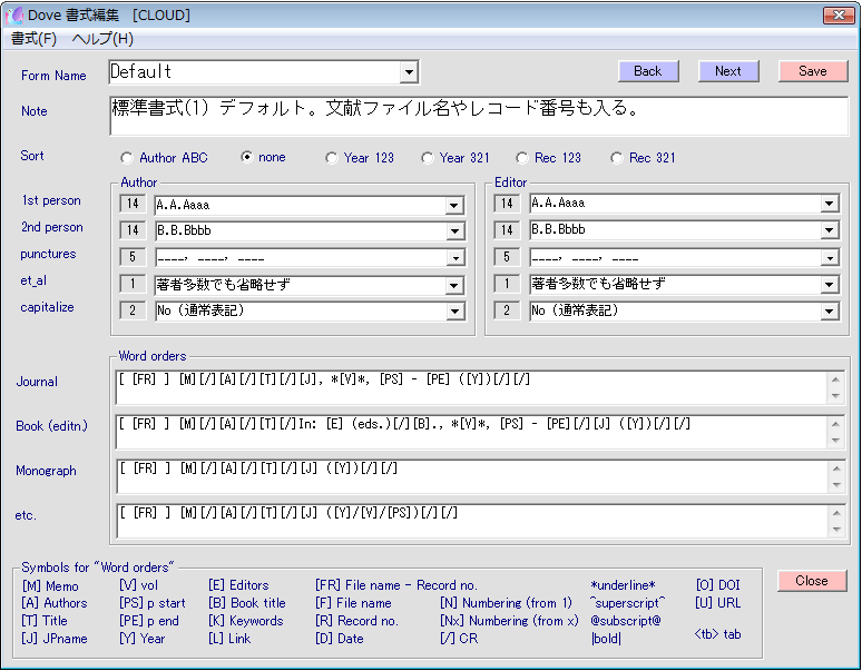 | [Save] | 登録や更新された書式の内容を保存します。 |